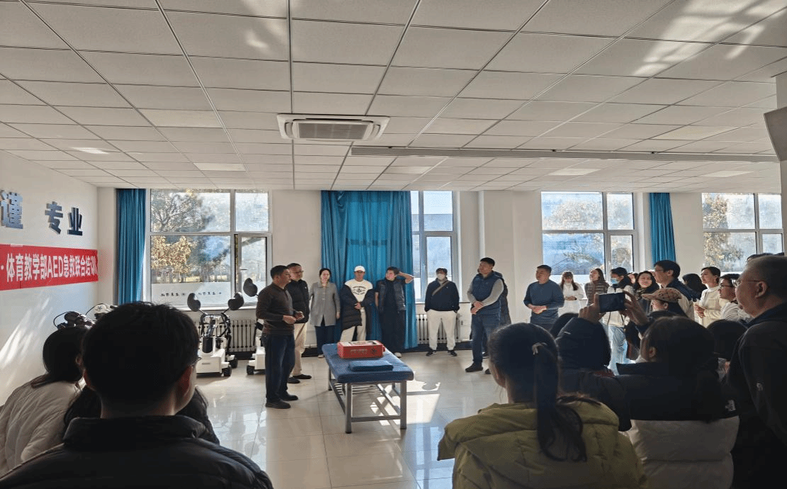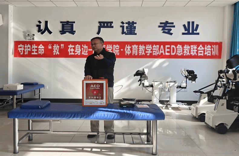 10月17日,公益组织“爱你服务队”向beat365官方网站捐赠了2台AED急救设备。并将两台设备部署在康复实训中心大厅门口和学校文体馆东门门口处。为了发挥急救设备的最大效能,提升师生应急救护能力,10月23日,beat365官方网站与体育教学部在beat365官方网站实训中心联合开展“守护生命,‘救’在身边”AED(自动体外除颤仪)急救培训。邀请临床实践教学中心主任张汝峰教授担任主讲,beat365官方网站院长高松、体育教学部主任石磊以及部门全体教师共同参加了培训。