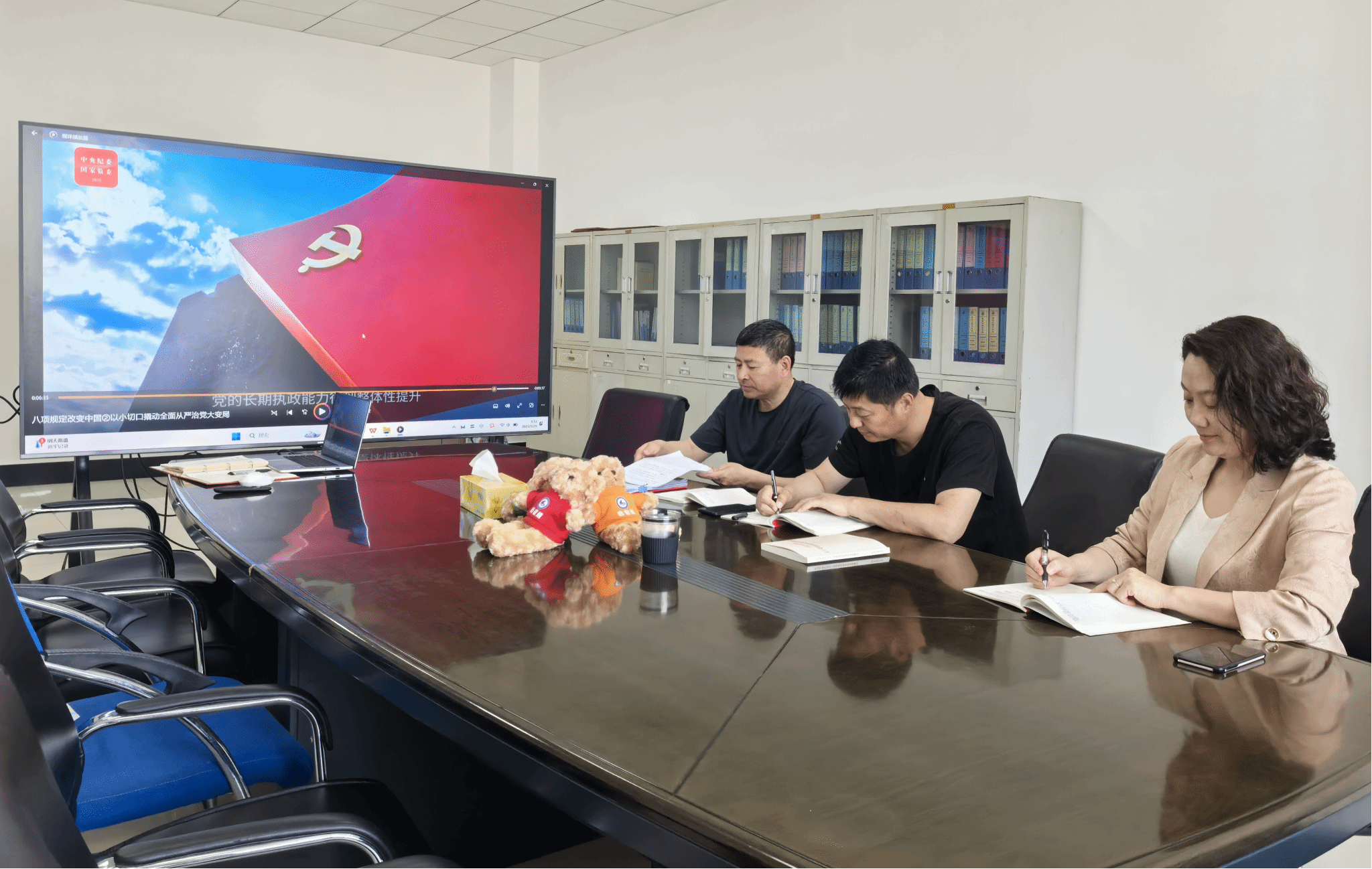 会议全文学习了《习近平关于加强党的作风建设论述摘编》第一部分“党的作风关系人心向背,决定党和国家事业成败”、第二部分“作风问题本质上是党性问题”、第四部分“中央八项规定是改进作风的切入口和动员令,是长期有效的铁规矩、硬杠杠”;与会人员集体收看了中央纪委国家监委推出的系列视频《八项规定改变中国》。